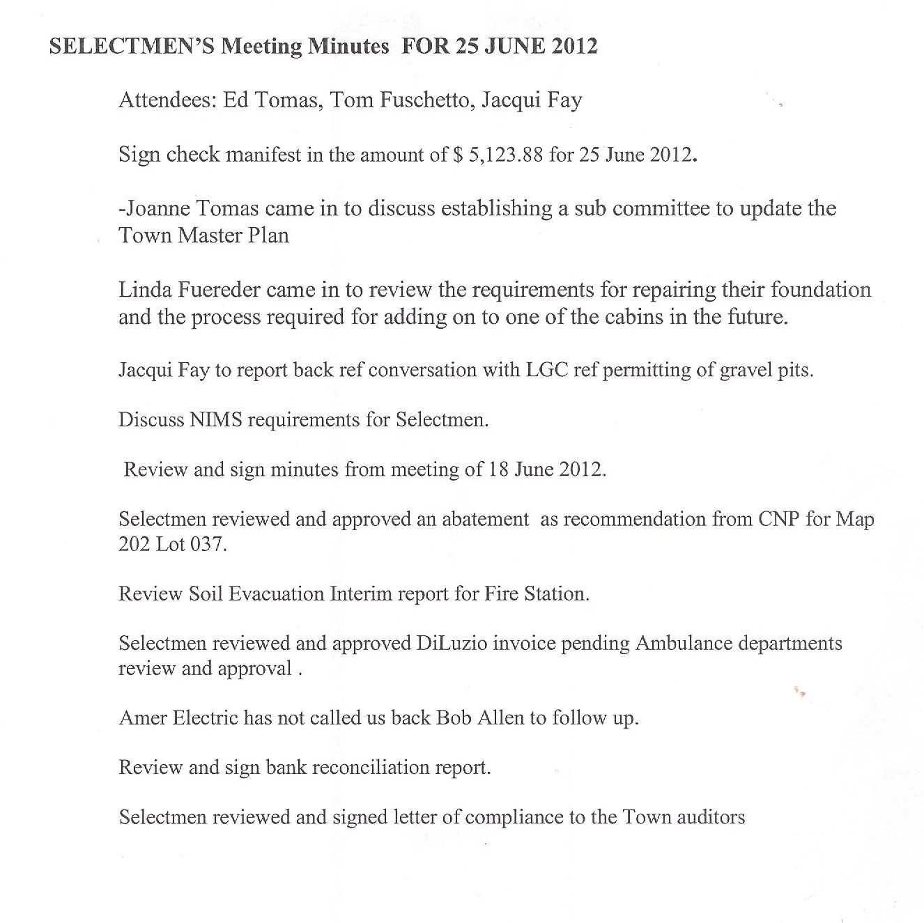 Selectmen reviewed and signed minutes from meeting of 11 June 2012.