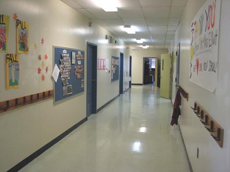 Mural in the library of the school mascot, the polar bear, painted by Kathy Peets.