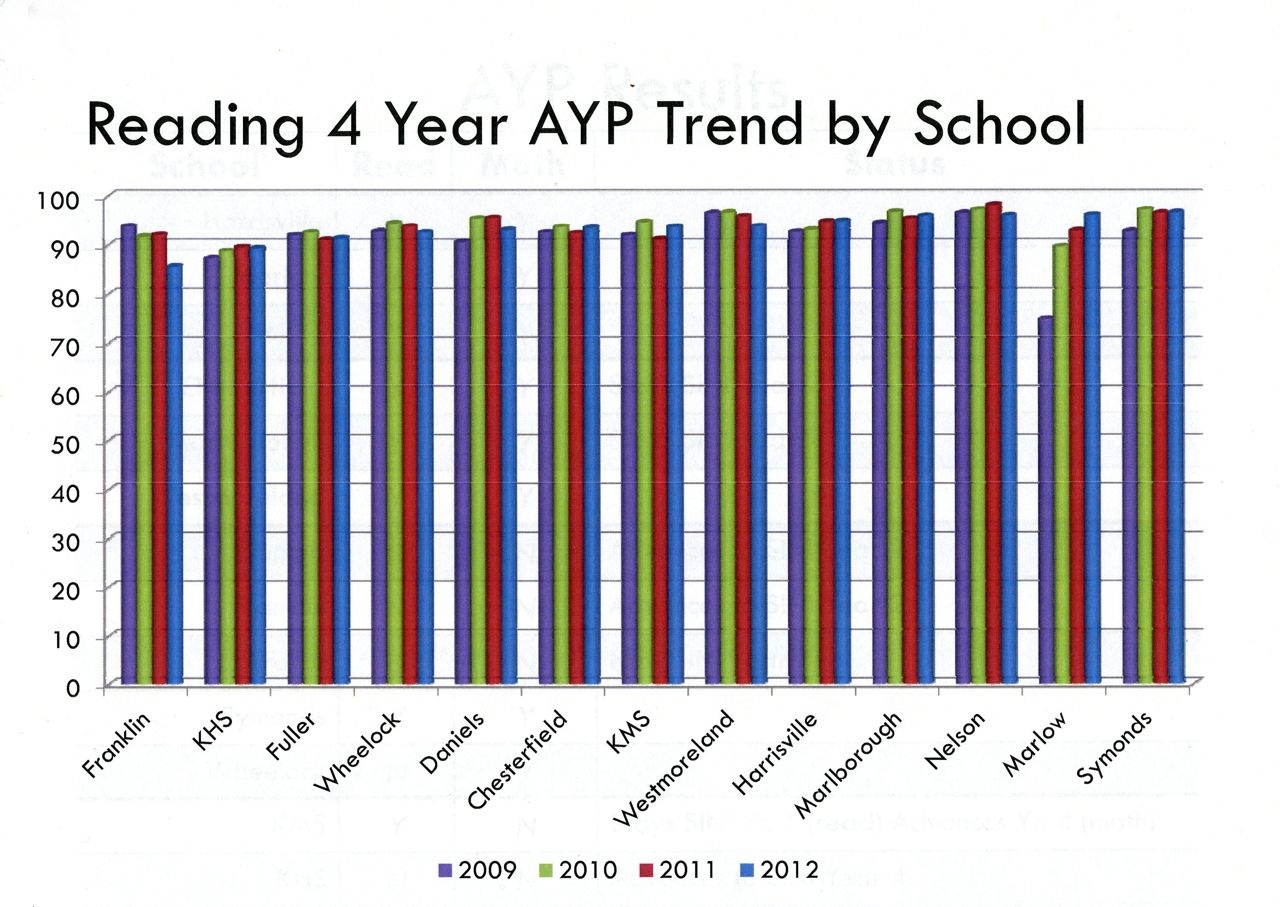 The two graphs below show the four year AYP trend for SAU 29 schools from 2009 through 2012. Marlow student achievement has greatly improved over this time period. Principal Phyllis Peterson noted in her Aprill 11, 2012 Principal's Report to the Marlow School board that she and the teachers are "all very proud of our students and families for their cooperation to make sure all students were present during testing." She also thanked families for providing snacks during the three weeks of testing. She added, "It truly makes a difference when we all work together."