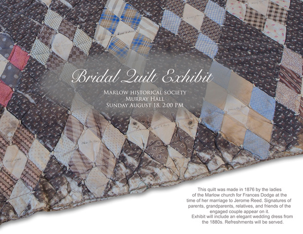 Hello to all members and friends of the Marlow Historical Society. We hope you will join us for our prime event of the summer, honoring an object of huge historic and sentimental value, which has been languishing in an archival box for years. You can read about this bridal album quilt made by Marlow church ladies in 1876 for Frances Dodge just before her 1877 wedding to Jerome Reed, and see the names of parents, grandparents, relatives and friends of the engaged couple that appear on it, in the Spring/Summer 2019 Historical Society newsletter.