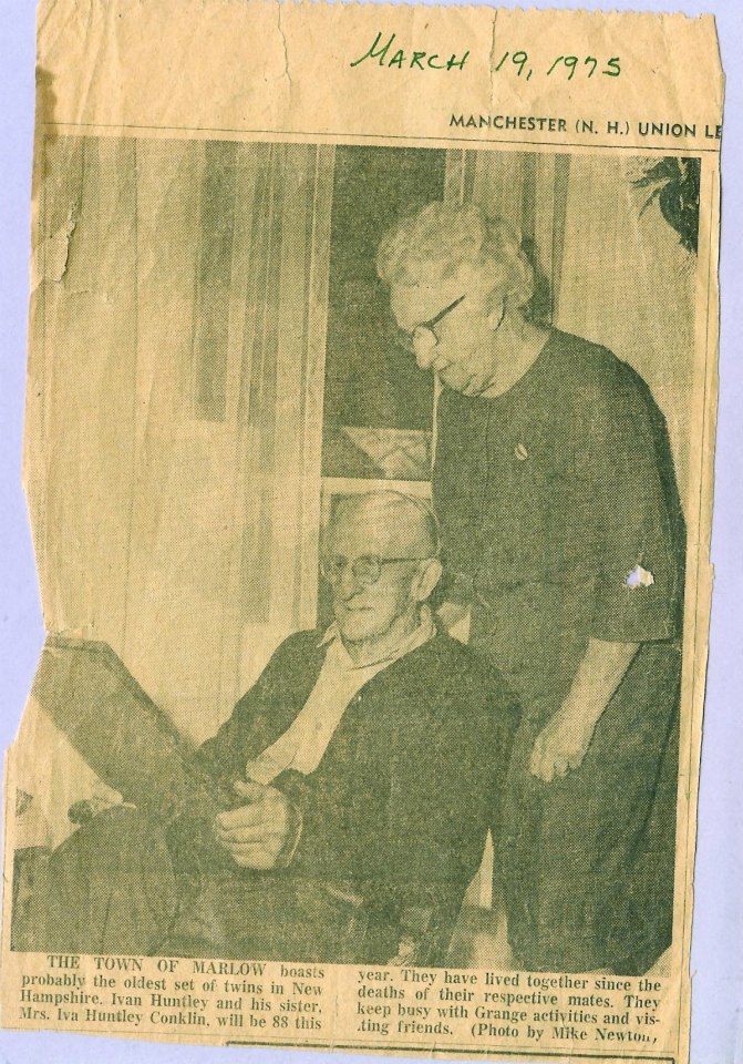 "The town of Marlow boasts probably the oldest set of twins in New Hampshire. Ivan Huntley and his sister, Mrs. Iva Huntley Conklin will be 88 this year. They have lived together since the deaths of their respective mates. They keep busy with Grange activities and visiting friends."