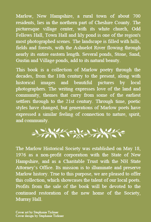 In 2016, the Marlow Historical Society published a book of Marlow poetry through the decades - from the 18th century to the present - matched with historical images and beautiful pictures by local photographers. The front cover is a watercolor by Marlow artist Stephanie Tickner, titled, "Ashuelot River from the Bridge to Cheshire Earth."