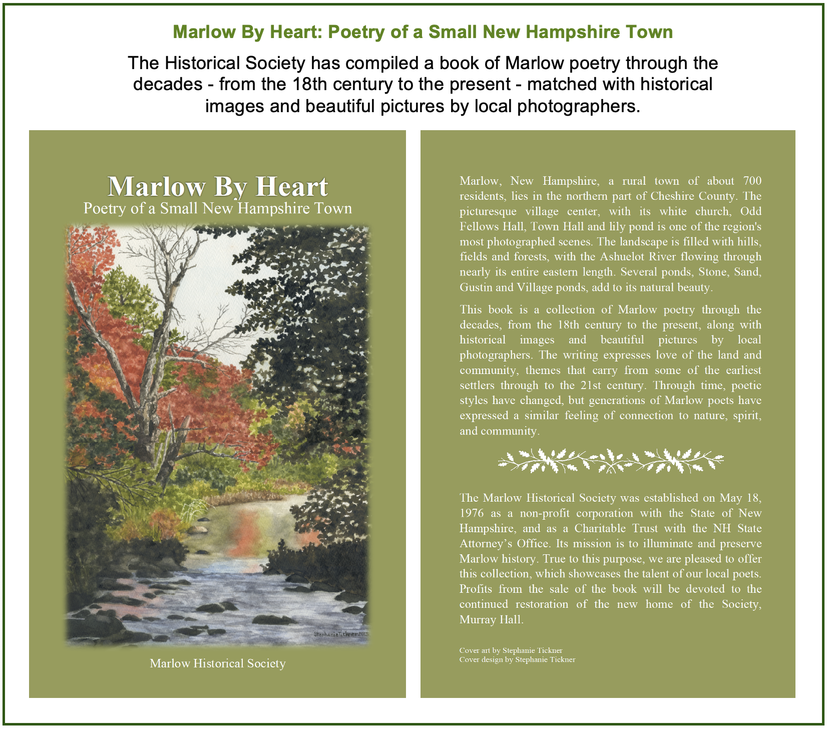 In 2016, the Marlow Historical Society published a collection of Marlow poetry from the 1700s to the present, with historical images and beautiful pictures by local photographers. The writing expresses love of the land and community, themes that carry from some of the earliest settlers through to today.
