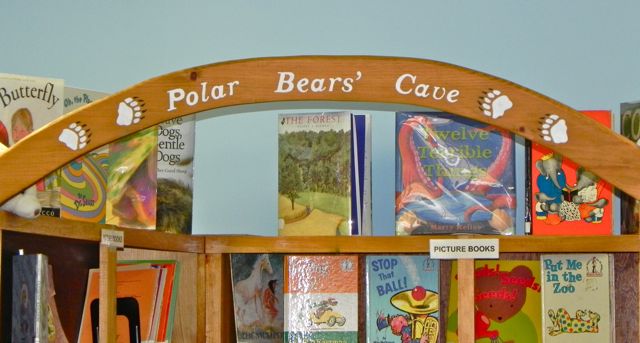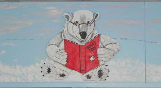 Mural in the library of the school mascot, the polar bear, painted by Kathy Peets.